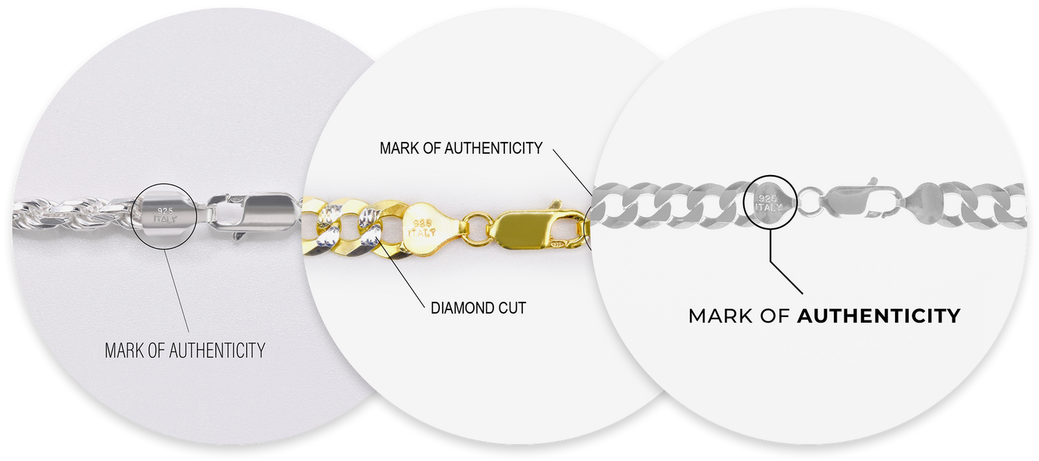 As shown in product photos our chains are officially marked with 925 and Italy to ensure authenticity. Our clients respect and trust the authentic sterling silver and fine Italian craftsmanship that this stamp ensures.